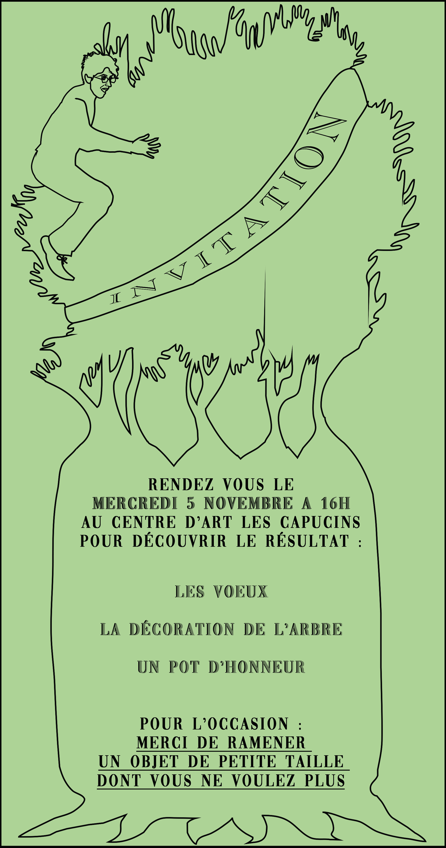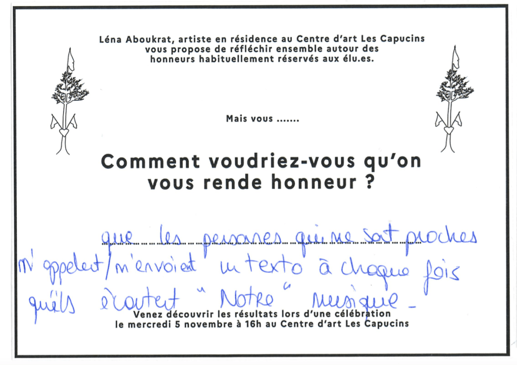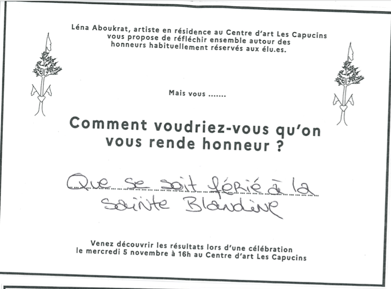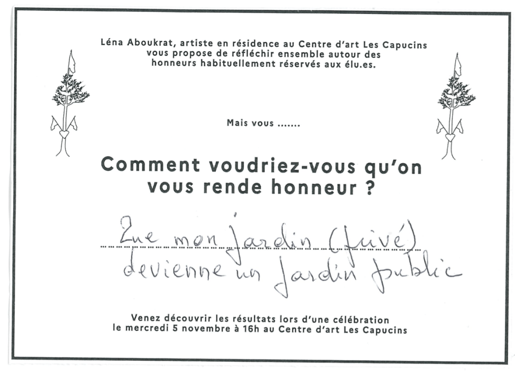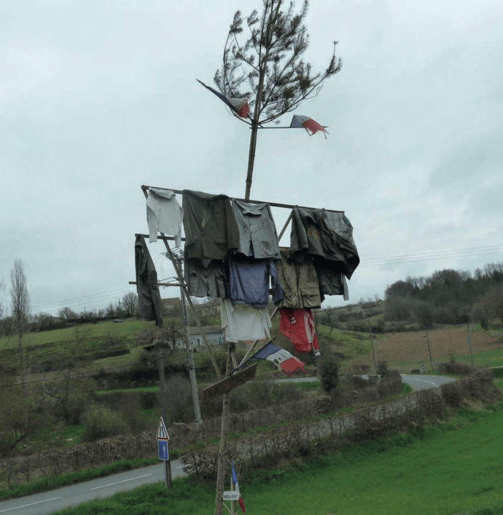 Lors de ma résidence de recherche j’ai proposé aux habitant.es d’en ériger un ensemble pour réfléchir aux honneurs que l’on mérite et retrouver les usages oubliés de ces arbres.