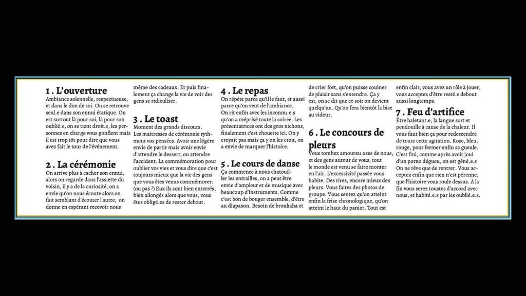Le temps d’une soirée, les croques morte·e·s vous font danser votre chagrin. Avec elleux rire c’est comme pleurer. Au programme : cérémonie, cours de valse, toast, concours de pleurs et feux d’artifices.
