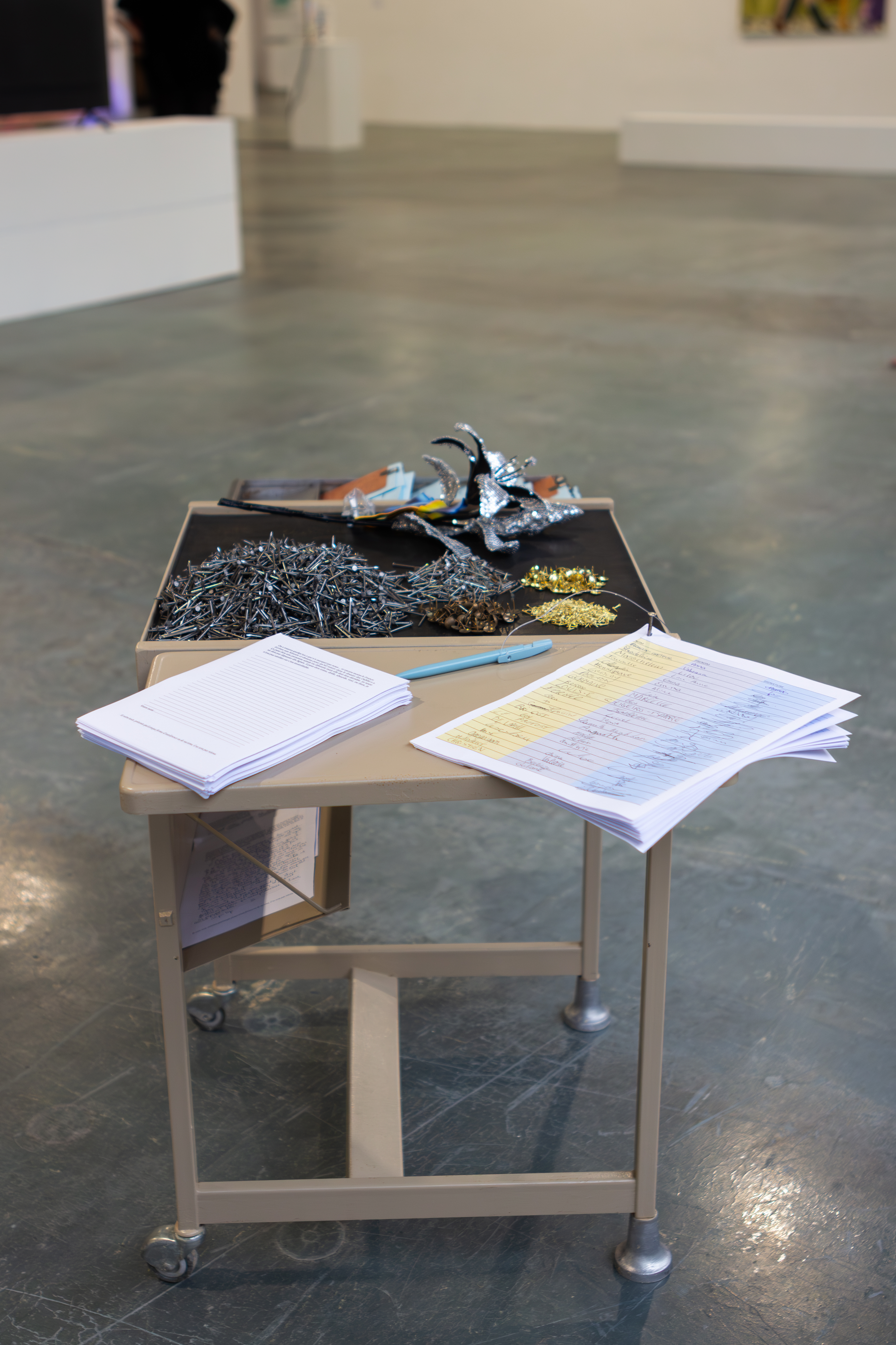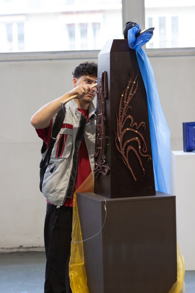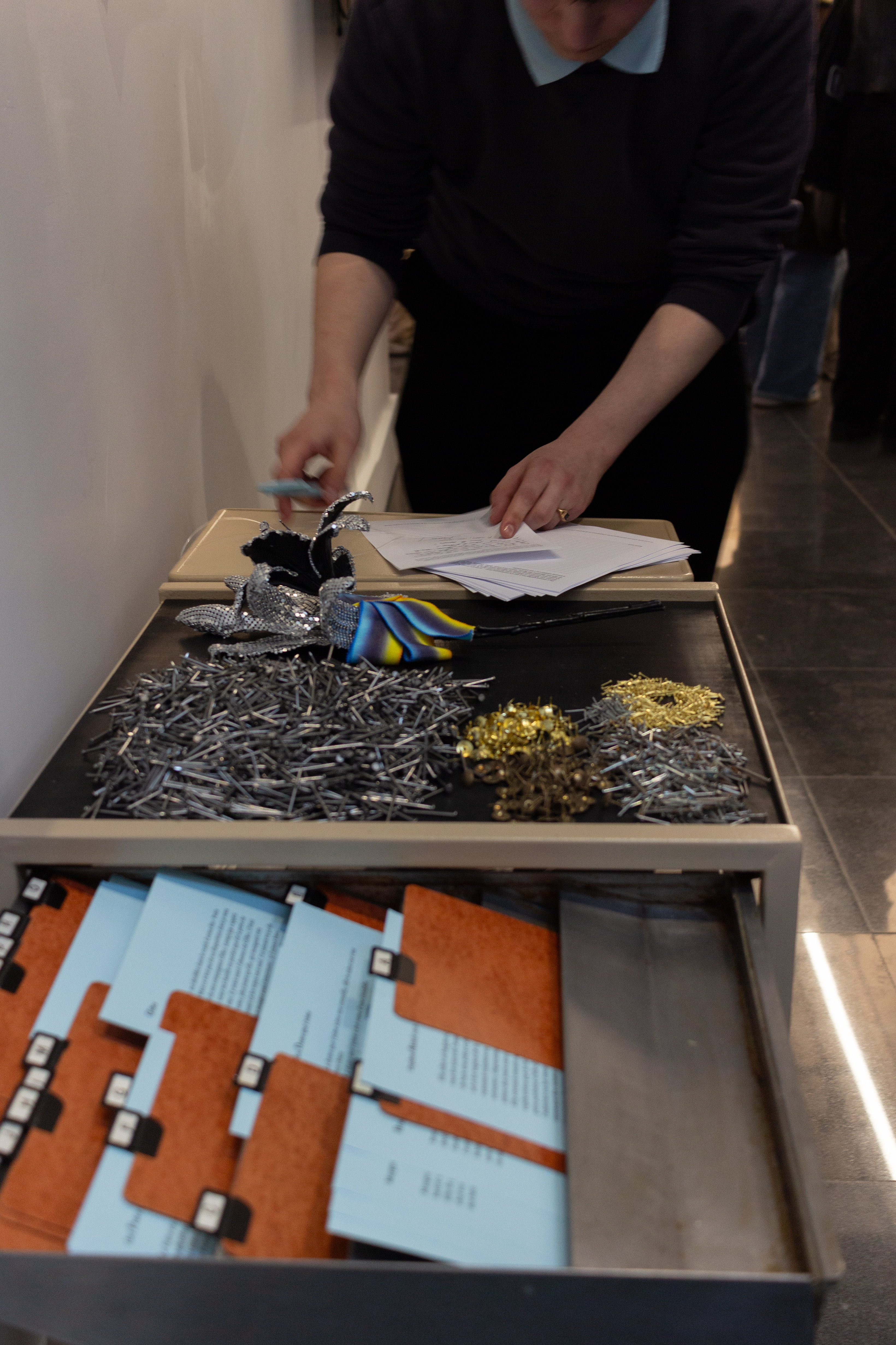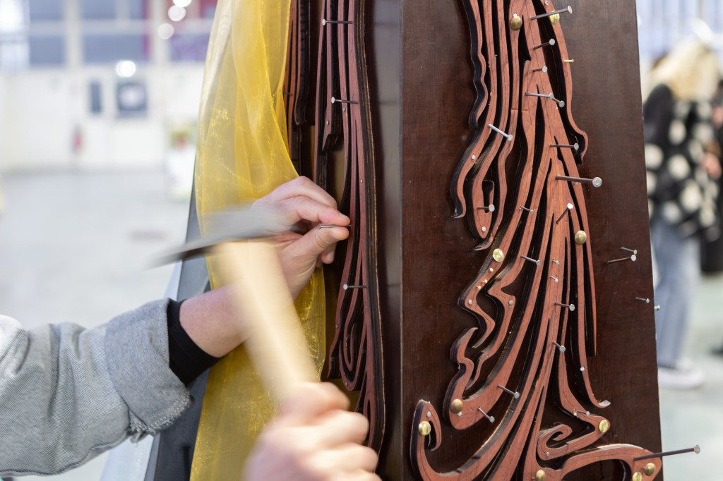 Le Bal des Oublié.e.s est une oeuvre participative. Les visiteur.euse.s peuvent partager les biographies de leurs proches décédés qu’iels considèrent comme oublié.e.s de l’histoire. Iels sont ensuite invitées à enfoncer un clou dans la statue en bois pour qu’ensemble nous la changions en métal, un geste emprunté à l’effort de guerre.